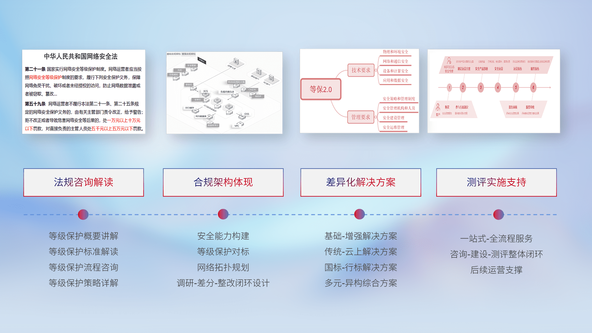 通过专业的法律咨询解读、、合规架构体现、、、差异化解决方案、、、、测试实施支持等服务,,,为客户量身打造等保合规体系。。